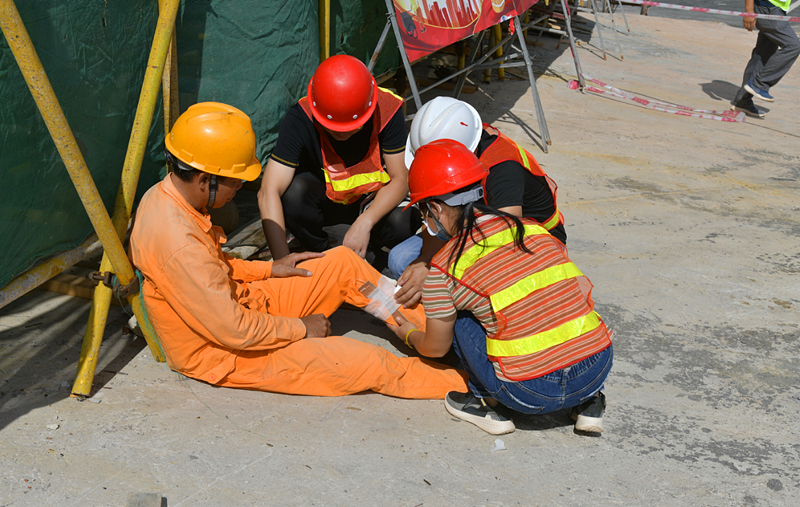 現(xiàn)場模擬一名工人在2#、3#廠房間的廊架上進(jìn)行施工作業(yè)時(shí),因未系安全帶、腳下未踩穩(wěn)造成高處墜落受傷,其他人員對其進(jìn)行急救的情況。從發(fā)現(xiàn)人員墜落受傷、疏散人群、封鎖現(xiàn)場到對受傷人員骨折部位用夾板進(jìn)行固定再送至醫(yī)院,僅歷時(shí)10分鐘。整個(gè)過程緊張有序,應(yīng)急處理得當(dāng)。演練中,現(xiàn)場每名救援人員嚴(yán)肅認(rèn)真對待每個(gè)演練細(xì)節(jié)。各應(yīng)急小組聞聲而動(dòng),各司其職,反應(yīng)迅速,各環(huán)節(jié)無縫銜接,使救援任務(wù)得以順利完成。