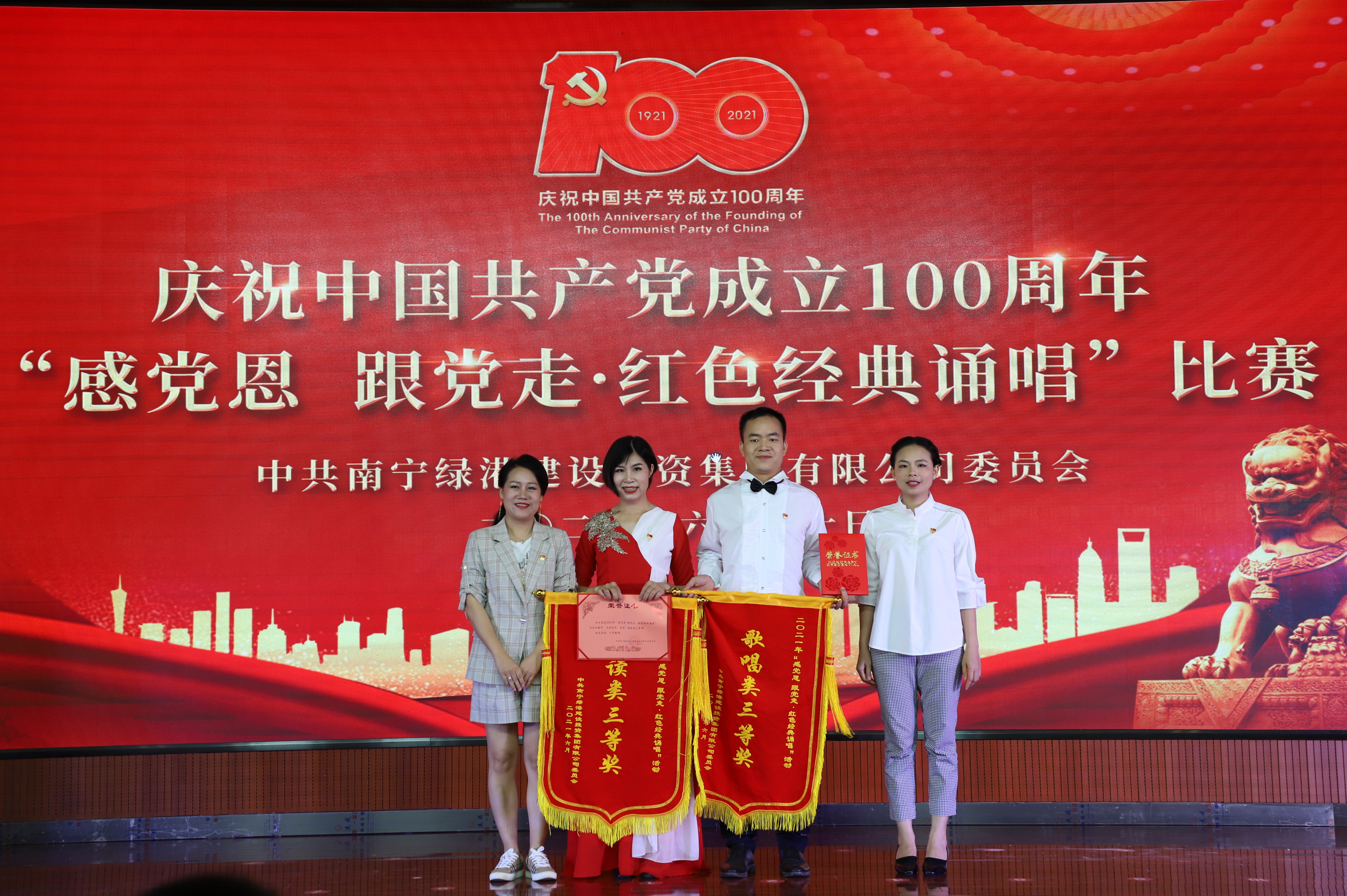 綠港集團(tuán)黨委書記、董事長龔國強(qiáng)和黨委副書記、總經(jīng)理鄧?yán)^慧為獲得誦唱類二等獎(jiǎng)的機(jī)關(guān)一支部頒獎(jiǎng)
