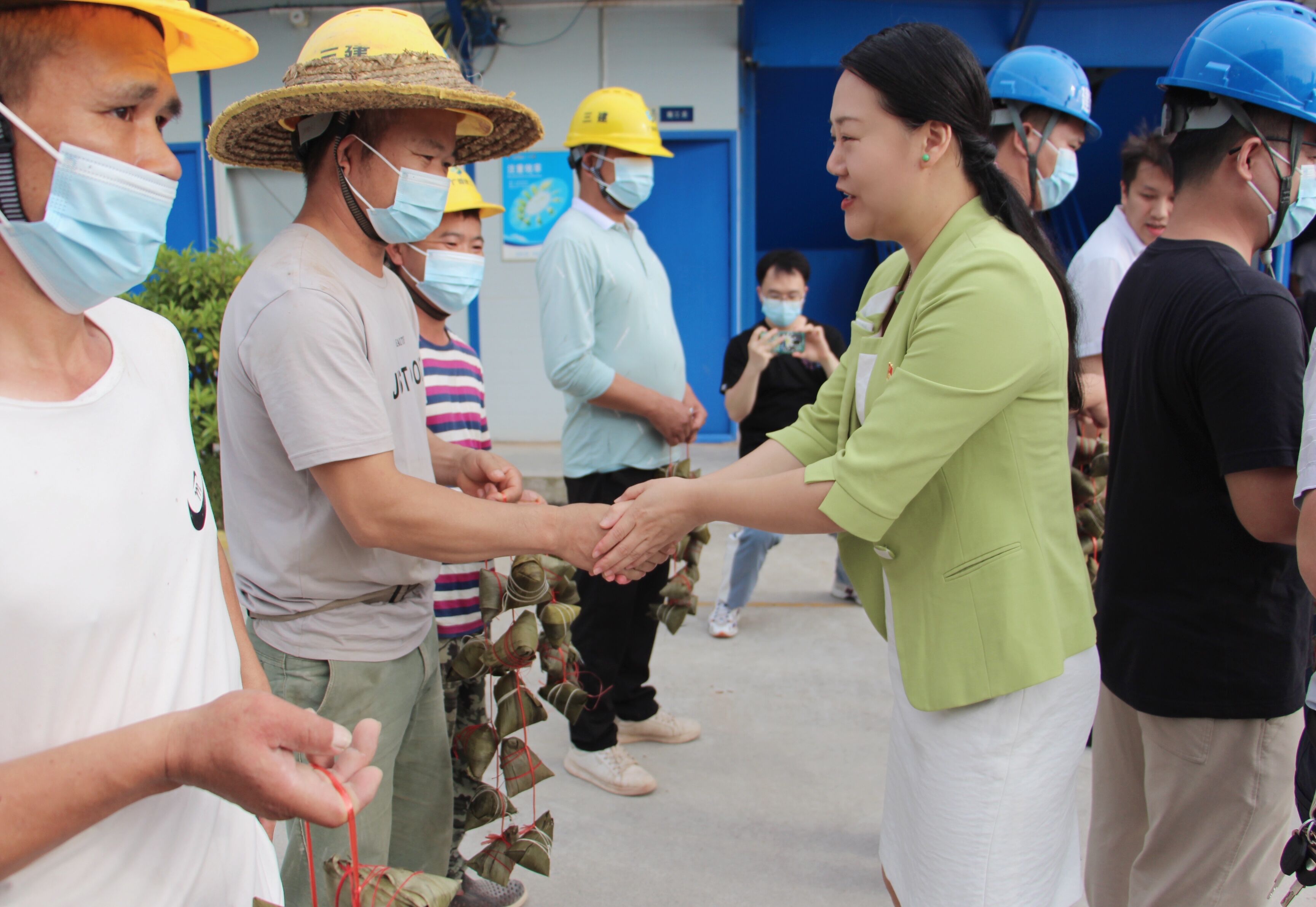 關(guān)心關(guān)懷進(jìn)工地,濃濃粽情暖人心。座談會后,此次聯(lián)建的各黨支部相關(guān)領(lǐng)導(dǎo)共同慰問了項目一線工人,為他們送去粽子等慰問品和最真摯的節(jié)日問候,感謝一線工人的辛勤勞動、敬業(yè)付出以及為綠港?金陽產(chǎn)業(yè)城等南寧市重點(diǎn)項目建設(shè)做出的貢獻(xiàn)。慰問中,綠港集團(tuán)黨委委員、副總經(jīng)理黃麗琴關(guān)切地詢問現(xiàn)場工人勞動安全保障情況和防疫情況,叮囑大家要注意勞動安全,防疫安全,堅持安全與生產(chǎn)兩手抓兩不誤,希望大家繼續(xù)保持昂揚(yáng)的斗志,以高度的責(zé)任感和飽滿的工作熱情投身到項目建設(shè)中,為經(jīng)開區(qū)社會經(jīng)濟(jì)高質(zhì)量發(fā)展作出貢獻(xiàn)。